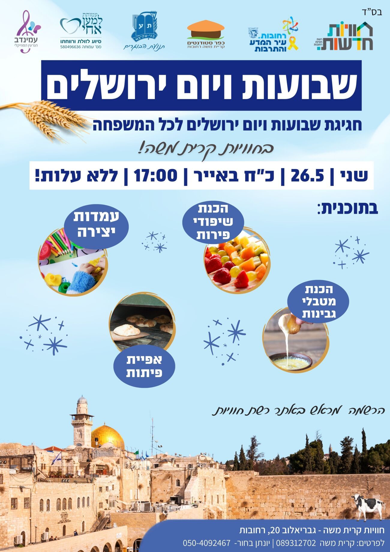 חוויות קרית משה מזמינה את הציבור לחגיגה משפחתית מיוחדת לכבוד שבועות ויום ירושלים. האירוע יתקיים ביום שני, 26 במאי (כ"ח באייר), בשעה 17:00.