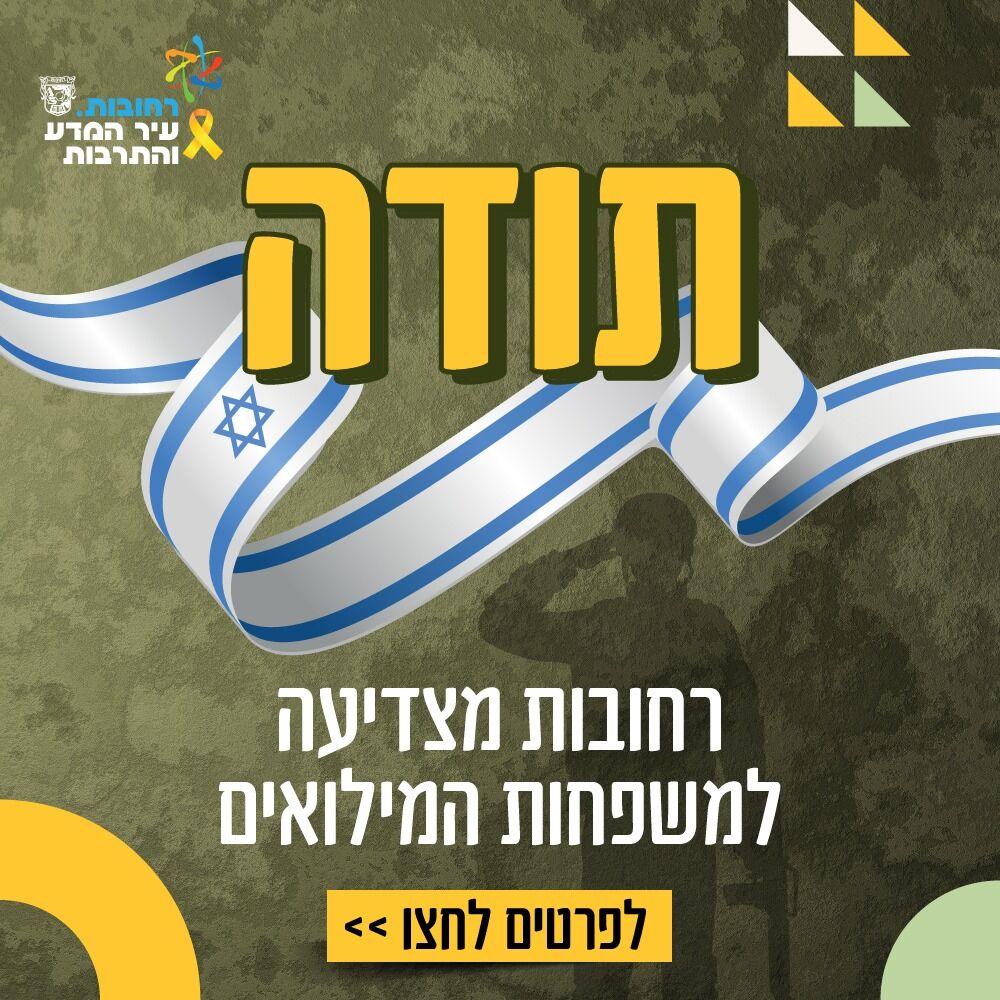 רחובות מצדיעה למשפחות המגויסים ומחבקת את נשות ואנשי כוחות המילואים והביטחון ובני משפחותיהם. הנחה בארנונה, סיוע רגשי, ליווי אישי ועוד - הפירוט המלא של ההטבות בלינק המצורף