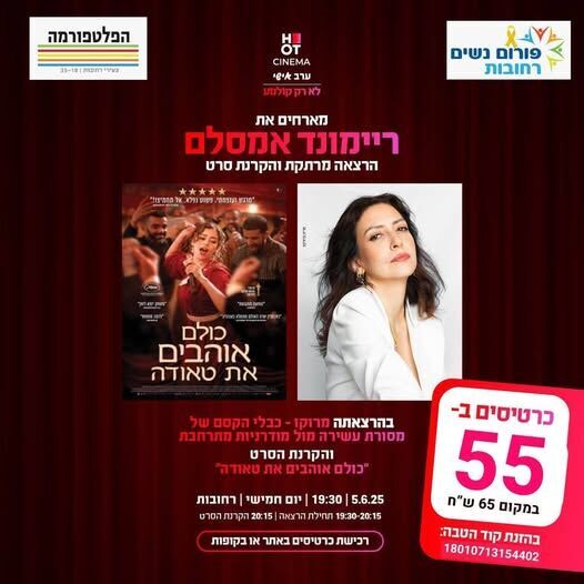 קהילת הנשים ברחובות מוזמנת להרצאה מרתקת של השחקנית והתסריטאית ריימונד אמסלם, שתתקיים ב-HOT CINEMA רחובות בתאריך 5.6.25.