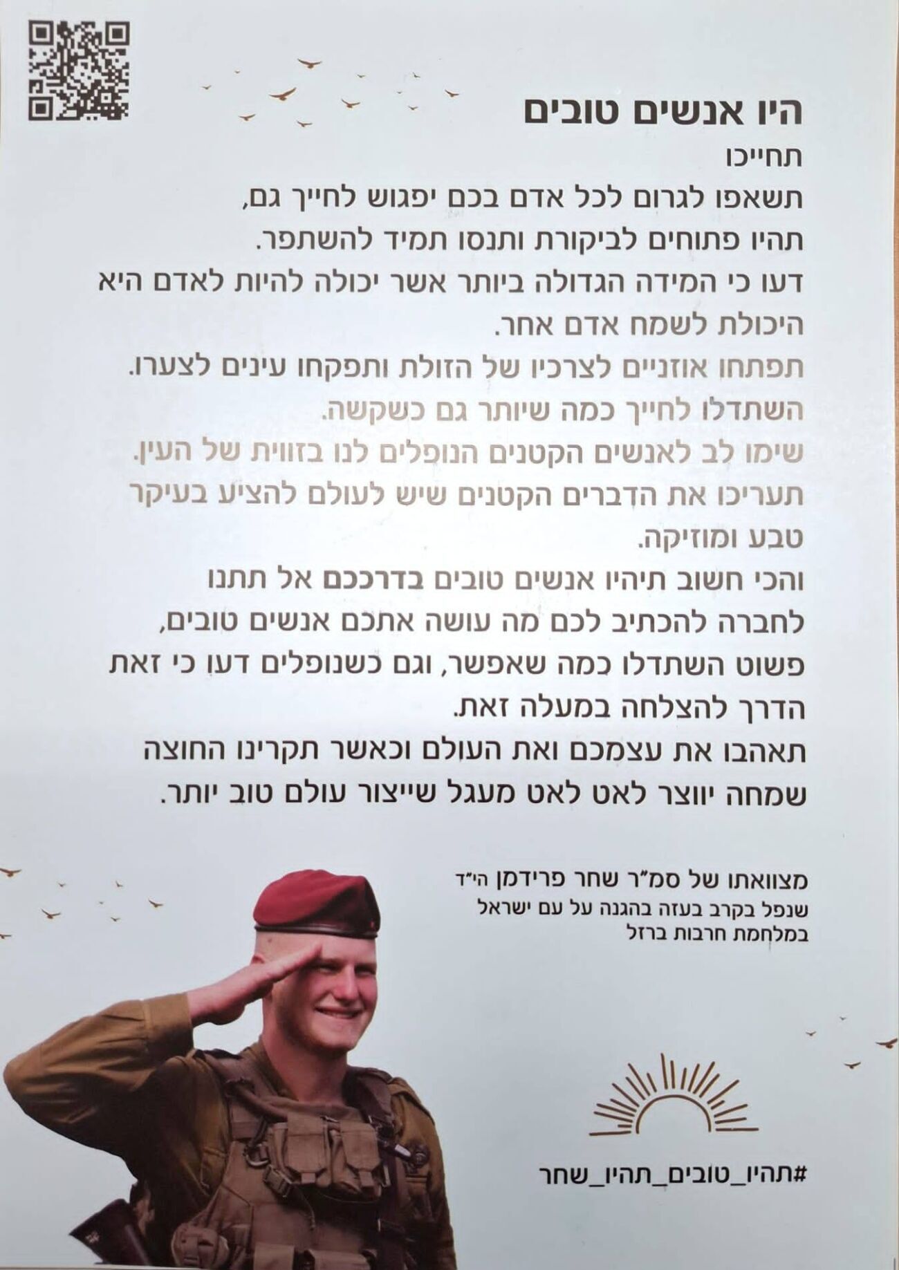 מעבר לסיוע המיידי, הערכות מסמלות חמלה, זיכרון והמשכיות. הן נתרמות באהבה להנצחתו של סמ"ר שחר פרידמן ז"ל, בן 21 מירושלים, לוחם בגדוד 101 של הצנחנים, שנפל בקרב בעזה ב-18 בנובמבר 2023.