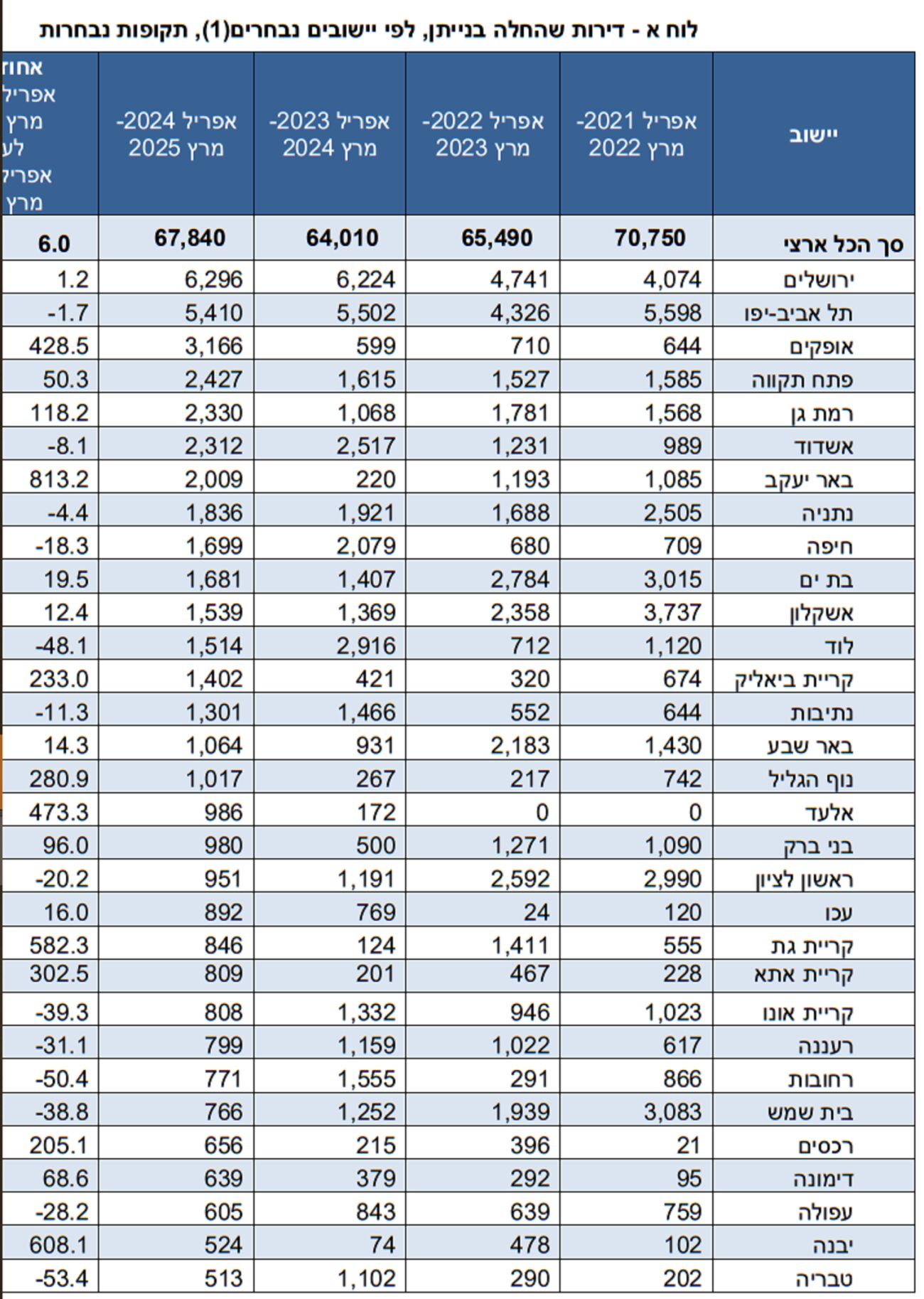 היישובים בהם החלה בנייתן של יותר מ2,000 דירות ב12 החודשים האחרונים היו: ירושלים עם 6,300 דירות, תל אביב עם 5,410 דירות, אופקים עם 3,170 דירות, פתח תקווה עם 2,430 דירות, רמת גן עם 2,330 דירות, אשדוד עם 2,310 דירות ובאר יעקב עם 2,010 דירות.