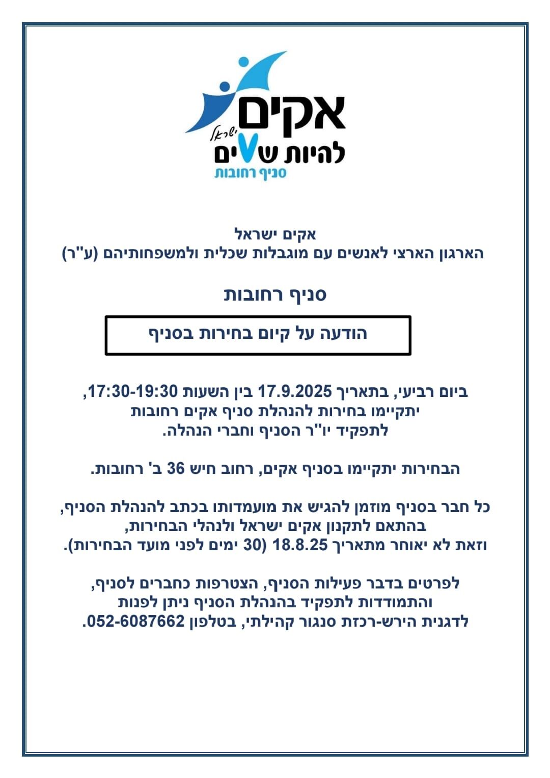 בחירות להנהלת סניף אקים רחובות יתקיימו ב-17.9.2025: ניתן להגיש מועמדות לתפקיד יו"ר הסניף וחברי ההנהלה