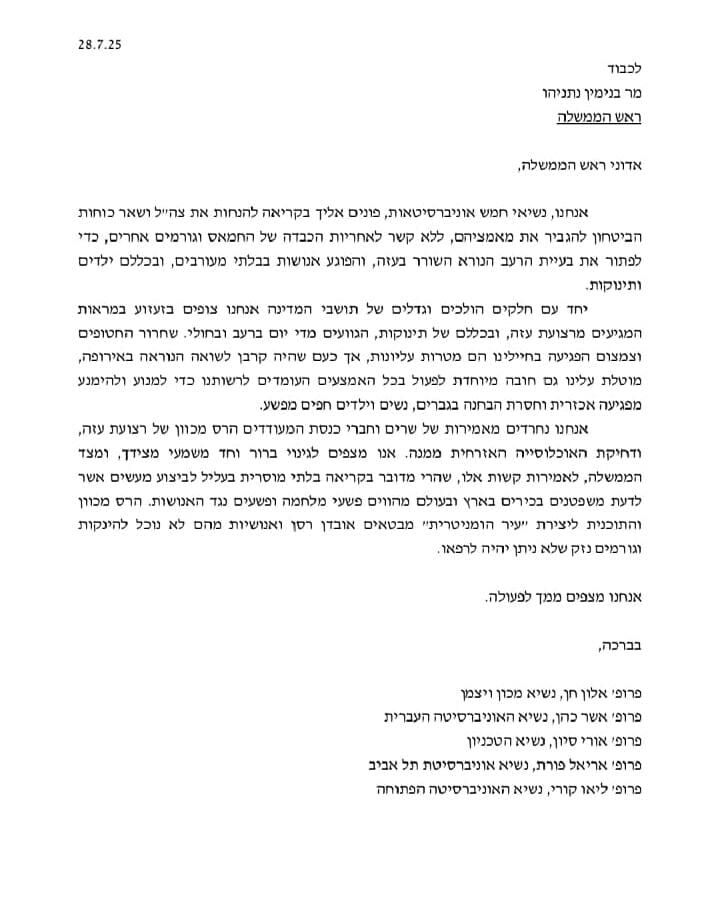 נשיאי מכון ויצמן, אוניברסיטת תל אביב, הטכניון האוניברסיטה הפתוחה, והאוניברסיטה העברית פנו לראש הממשלה בדרישה שיפעל לפתור את בעיית הרעב ברצועת עזה