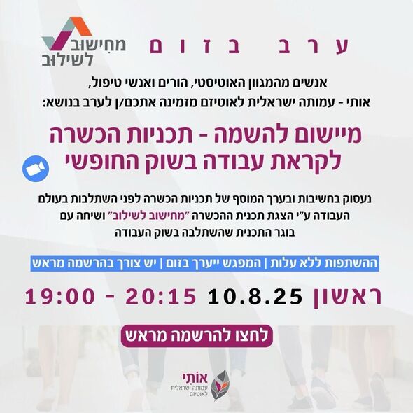 ערב חשיפה מקוון באמצעות ZOOM, המיועד להצגת תכניות הכשרה לקראת השתלבות בשוק העבודה עבור בוגרים ובוגרות על הרצף האוטיסטי המתגוררים ברחובות.