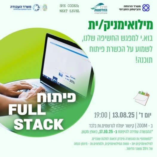 הזדמנות למשרתי מילואים: מרכז הזדמנות רחובות ו-She Codes מציעים הכשרה מסובסדת בפיתוח תוכנת Full Stack, מפגש חשיפה יתקיים ב-13.08.2025