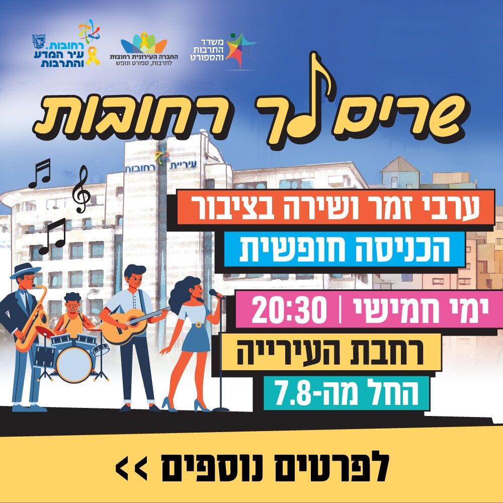 עיריית רחובות, באמצעות החברה העירונית, מזמינה את תושבות ותושבי העיר לשוב ולשיר בערבי הקיץ ברחבת העירייה, במסגרת סדרת מופעי המוזיקה והזמר העברי האהובה "שרים לך רחובות", החוזרת בפעם ה-16 לרחובות. וסדרת המופעים גם תכלול מחווה ישראלית מרגשת ליוצר מתי כספי
