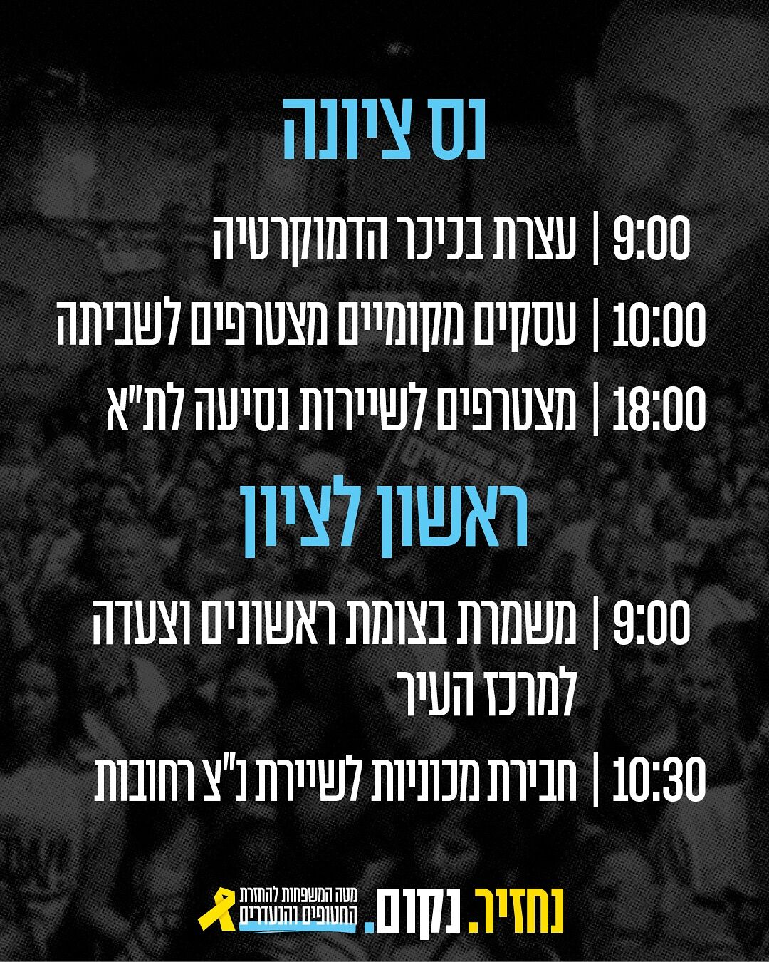 18:00 יציאה בשיירות לכיכר החטופים בתל אביב וחבירה לאירוע המרכזי