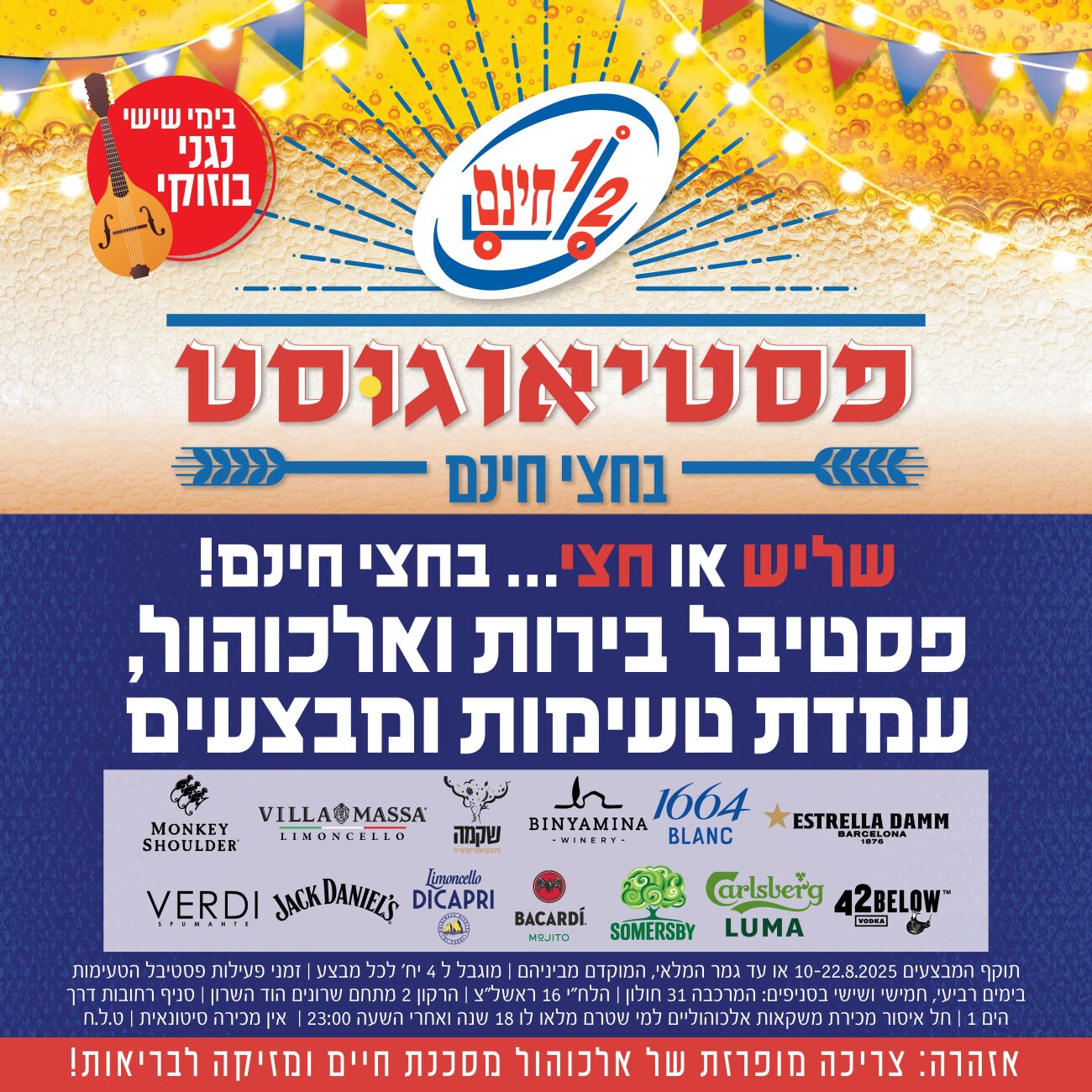 פסטיבל האלכוהול הצבעוני של רשת הסופרים חצי חינם, "פסטיאוגוסט", יתקיים גם השנה כאשר בכל סניפי הרשת יוכלו הלקוחות ליהנות ויציע מגוון מבצעים אטרקטיביים במחלקת היינות, האלכוהול והבירות. בנוסף בסניפים הגדולים בחולון, ראשון לציון, הוד השרון והסניף החדש ברחובות יוקמו עמדות טעימות ונשנושים בימים רביעי, חמישי ושישי, כאשר בימי שישי הלקוחות ייהנו מאווירה יוונית בתוך הסניף- נגני בוזוקי שינעימו את זמן של הלקוחות בסניפים בין השעות 11:30-13:30. מבין מותגי האלכוהול המובילים שיוצעו בעמדות: יקב בנימינה | קרלסברג לומה | יין ורדי | מנקי שולדר | סומרסבי | וילה מסה | שקמה | בקרדי מוחיטו ועוד.