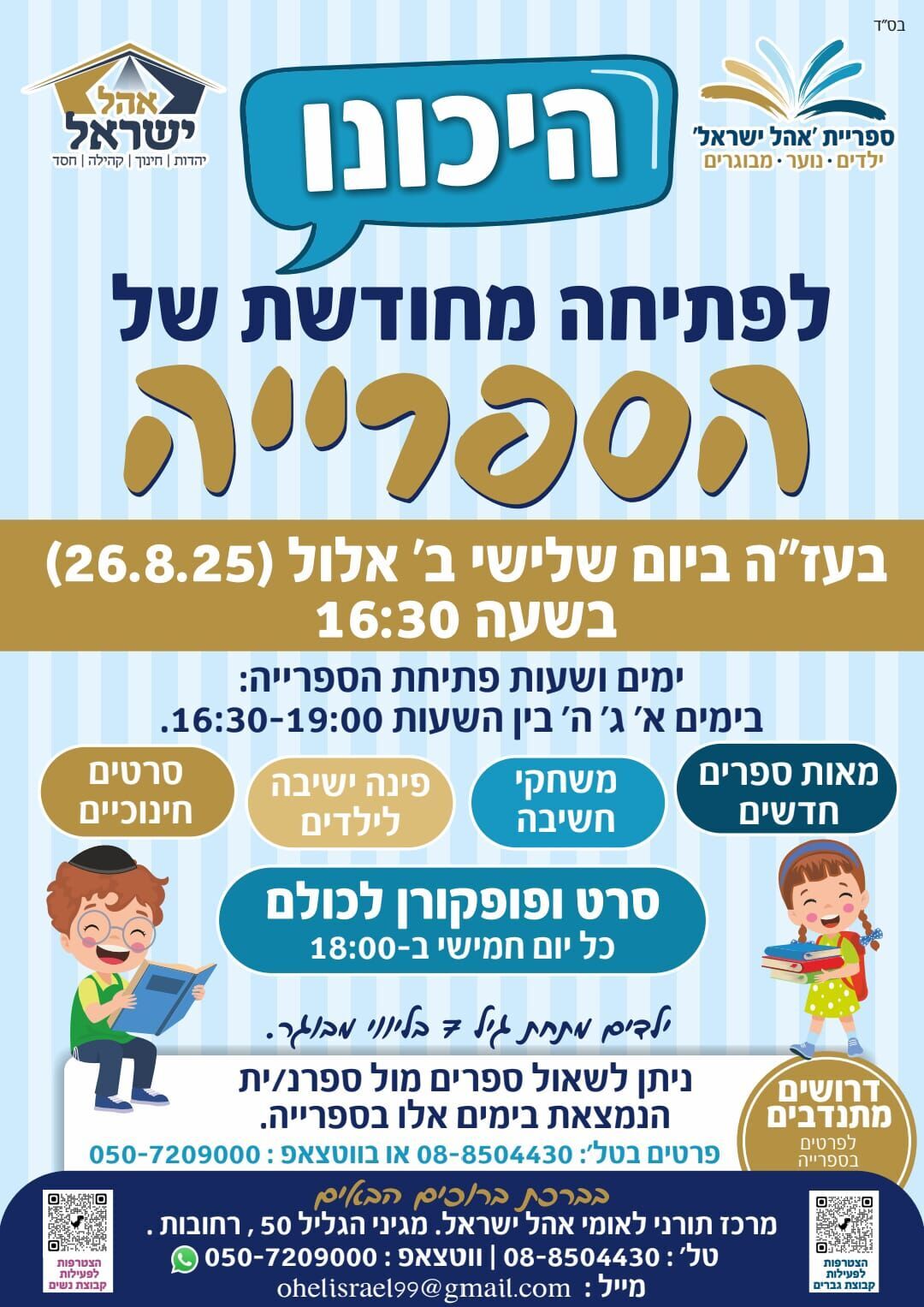 הכניסה לספרייה וההשתתפות בפעילויות הינה חופשית ופתוחה לציבור הרחב. לפרטים נוספים ניתן ליצור קשר בטלפון 08-8504430 או באמצעות ווטסאפ במספר 050-7209000.