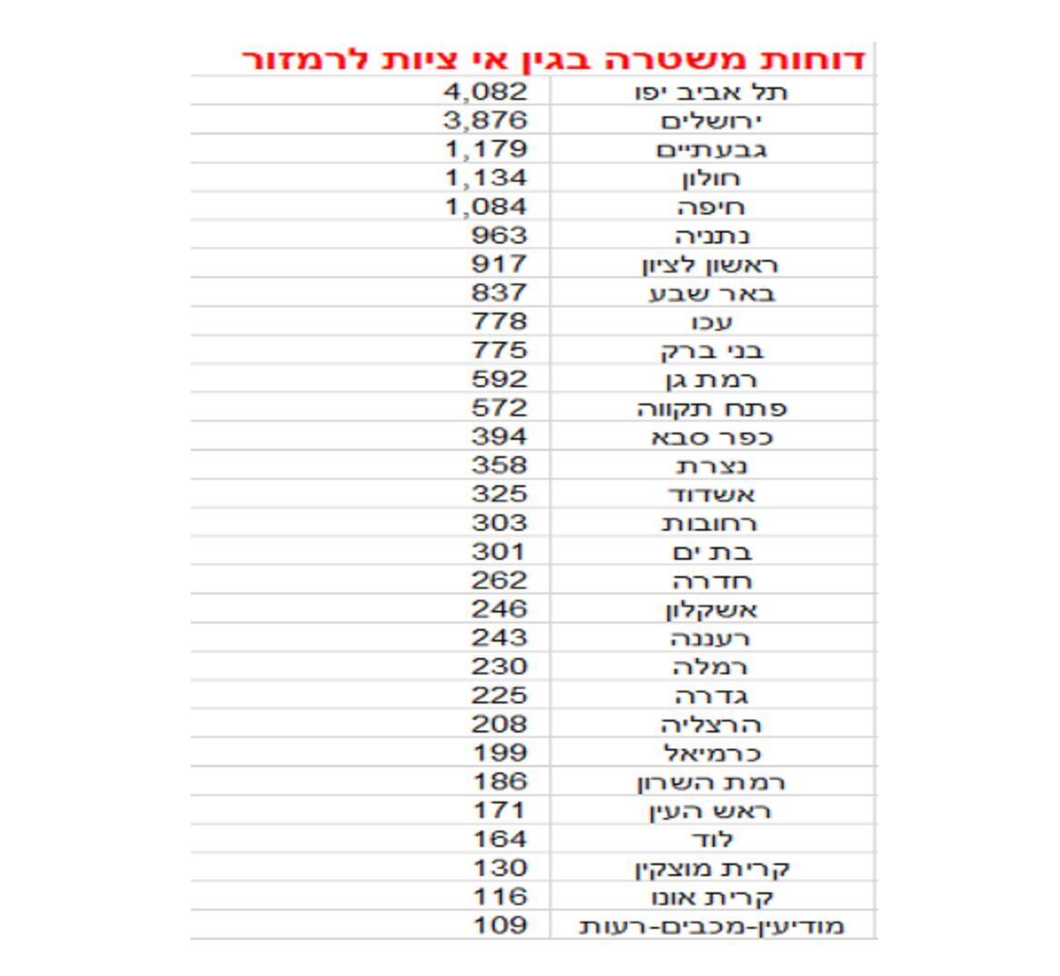 4,082 דוחות בגין אי ציות לרמזור נרשמו לנהגים בתל אביב-יפו בשנת 2024 -הגבוה ביותר מבין כלל הערים. בירושלים שנמצאת במקום השני נרשמו 3,876 דוחות בגין אי ציות לרמזור. גבעתיים ניצבת במקום השלישי במספר הדוחות בגין אי ציות לרמזור - 1,179 דוחות. בחולון נרשמו 1,134 דוחות לנהגים שלא צייתו לרמזור וחיפה סוגרת את החמישייה הפותחת עם 1,084 דוחות בשל אי ציות לרמזור.