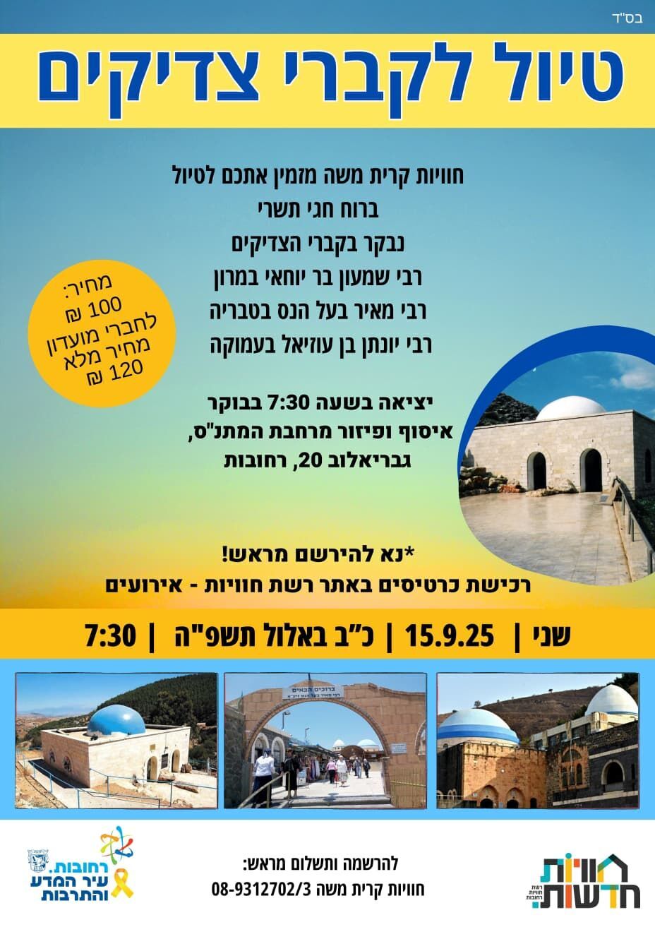 לקראת חגי תשרי: חוויות קרית משה מארגנים טיול לקברי צדיקים בצפון ב-15.9.25, כולל ביקור במירון, טבריה ועמוקה. להרשמה: 08-9312702