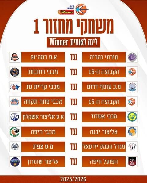 הגרלת ליגה לאומית Winner לעונת 2025/26: אליצור יבנה תפגוש את מכבי חיפה במחזור הפתיחה, נקבעו גם משחקי שמינית גמר גביע המדינה