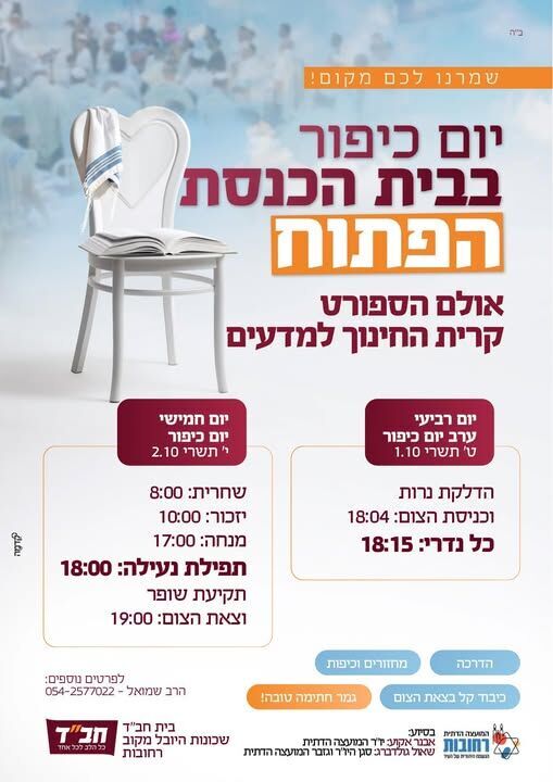 בית חב"ד שכונות היובל ומקוב ברחובות מפעיל גם השנה את מיזם 'בית כנסת הפתוח' ומזמין את הציבור הרחב להצטרף לתפילות יום הכיפורים.