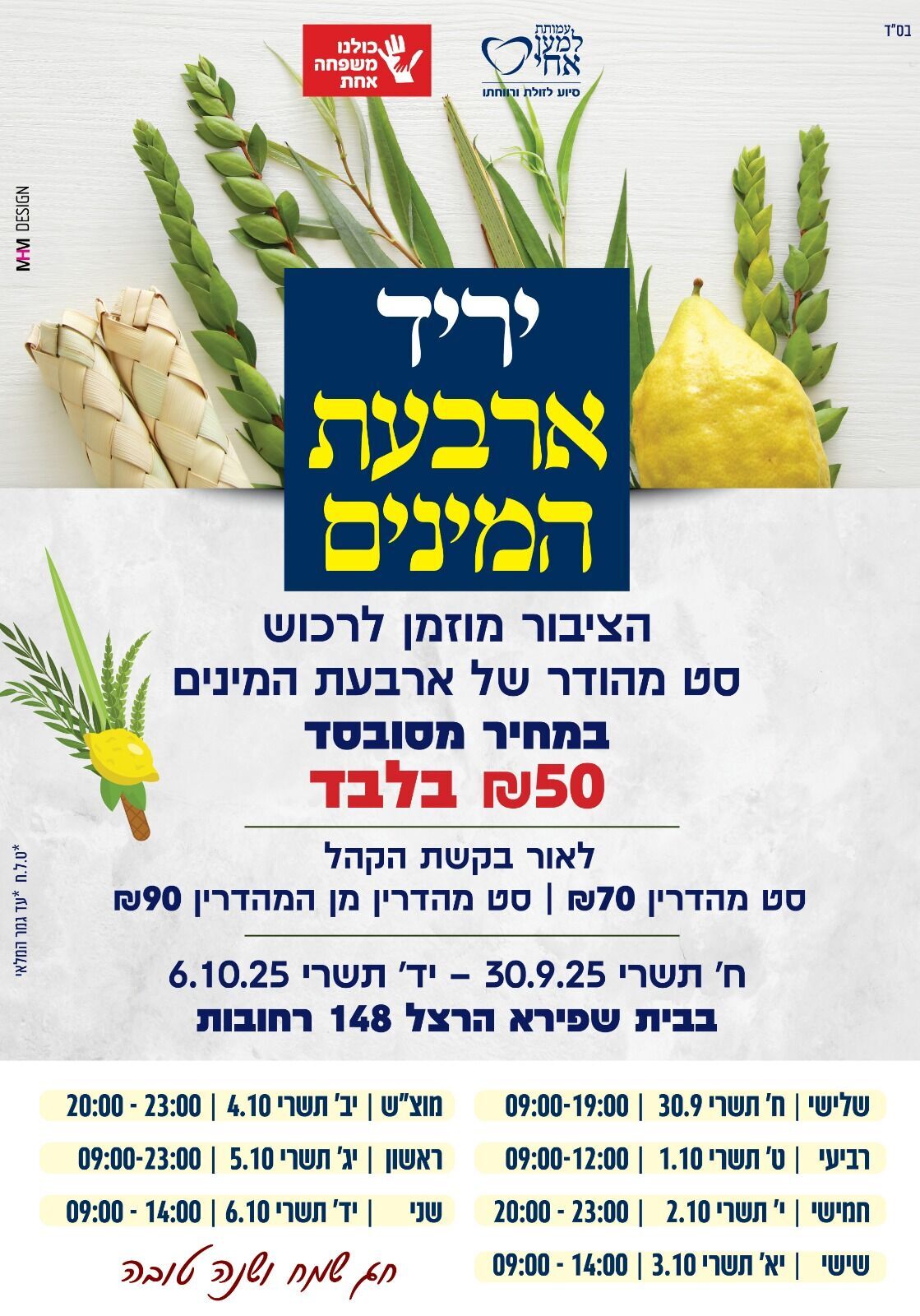 תזכורת - יריד ארבעת המינים מתקיים בבית שפירא ברחוב הרצל 148 ברחובות היום שני ערב חג עד השעה 14:00. סט מהודר במחיר מסובסד של 50 ש"ח בלבד.