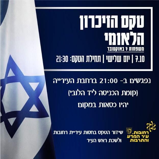 את הערב תפתח ויקי כהן, אמו של נמרוד. בשעה 21:30 יוקרן בשידור חי טקס הזיכרון הלאומי, יוזמה של משפחות ה-7.10, שישודר מפארק הירקון.