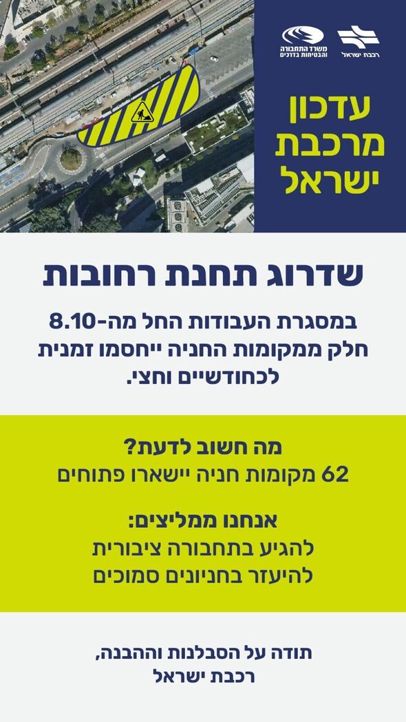 החל מיום ראשון, 8 באוקטובר, ולמשך תקופה של כחודשיים וחצי, חלק ממקומות החניה בחניון הדרומי של תחנת הרכבת ייחסמו. עם זאת, 62 מקומות חניה יישארו פתוחים לשימוש הציבור.