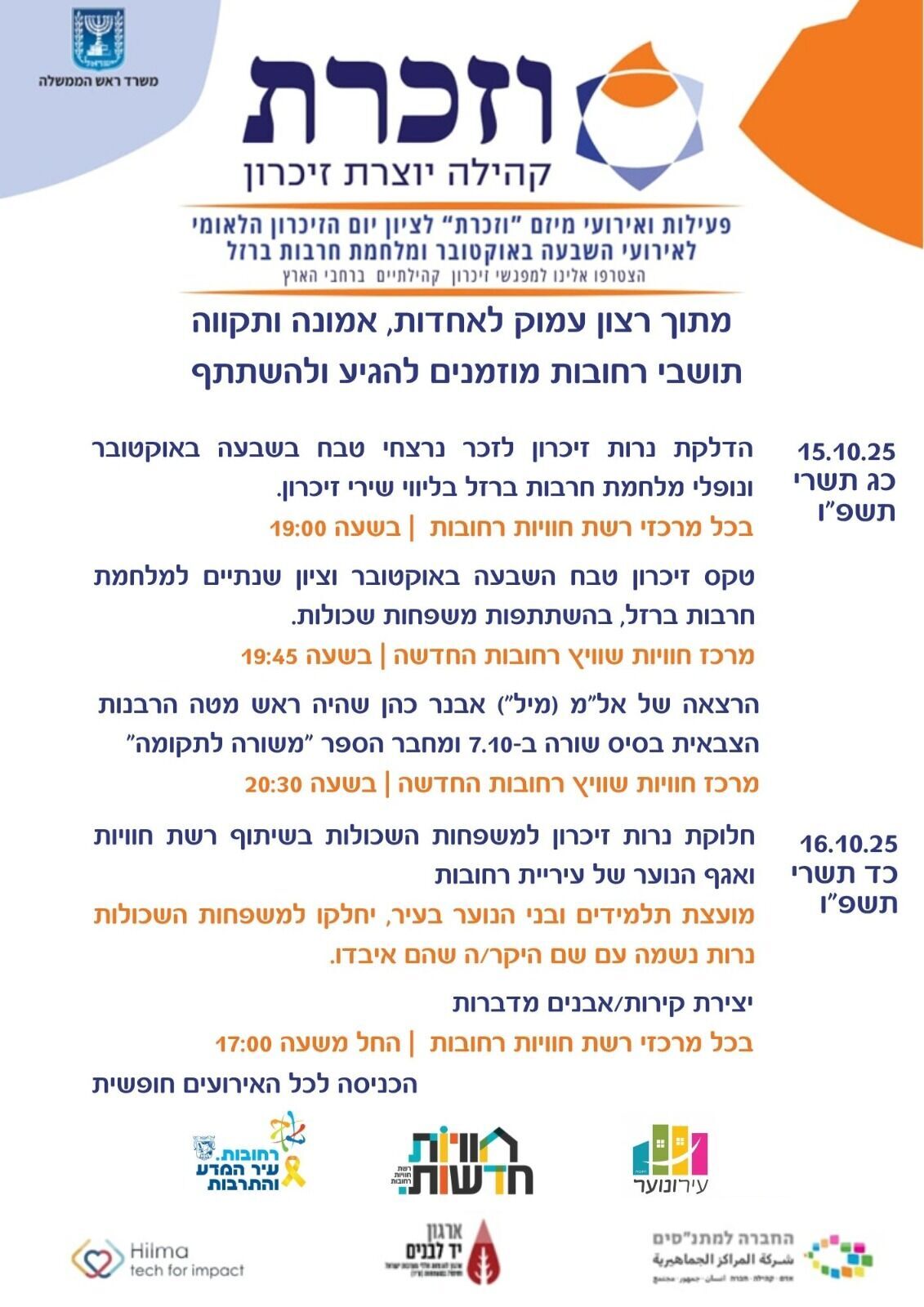 הדלקת נרות זיכרון: לזכר נרצחי טבח בשבעה באוקטובר ונופלי מלחמת חרבות ברזל בליווי שירי זיכרון. 15.10.25 | בכל מרכזי רשת חוויות רחובות | בשעה 19:00. במסגרת המיזם יודלקו נרות נשמה עם שמות כל הנופלים והחללים בעיר, ב-21 מרכזים קהילתיים, ובמוקדים נוספים בעיר.