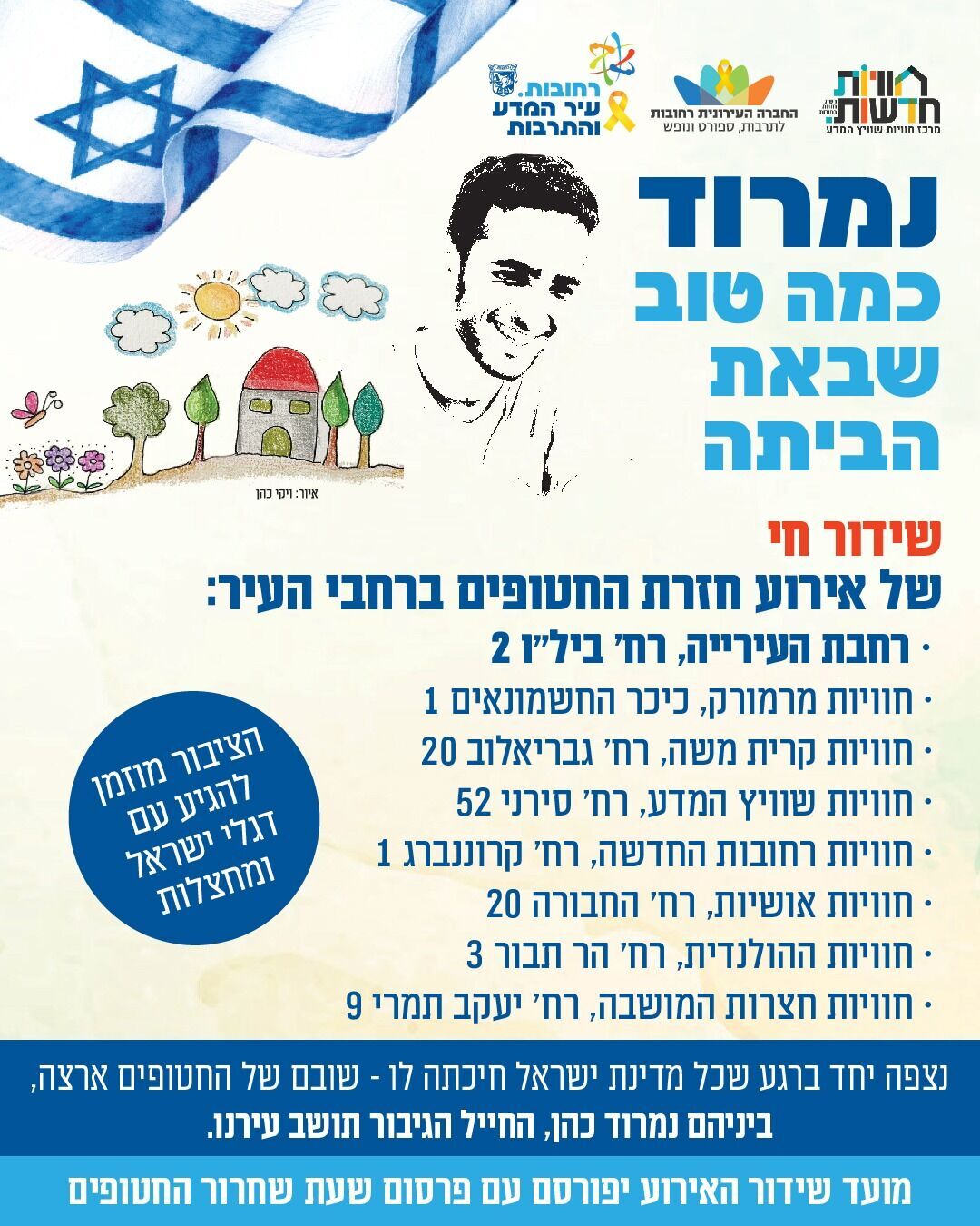 עיריית רחובות הודיעה כי תקיים שידורים חיים של אירוע חזרת החטופים במספר מוקדים ברחבי העיר, לכבוד שובם ארצה וביניהם החייל הגיבור, נמרוד כהן, תושב העיר.