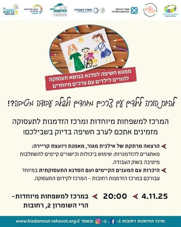 ביום שלישי 4.11 יתקיים מפגש חשיפה לסדנה בנושא תעסוקה למשפחות המיוחדות ברחובות - לינק להרשמה בכתבה