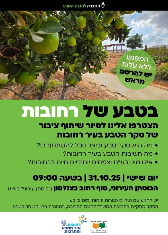 עיריית רחובות מודיעה על השקת סקר טבע עירוני חדש ברחבי העיר. הסקר מתבצע בשיתוף פעולה עם המשרד להגנת הסביבה והחברה להגנת הטבע.