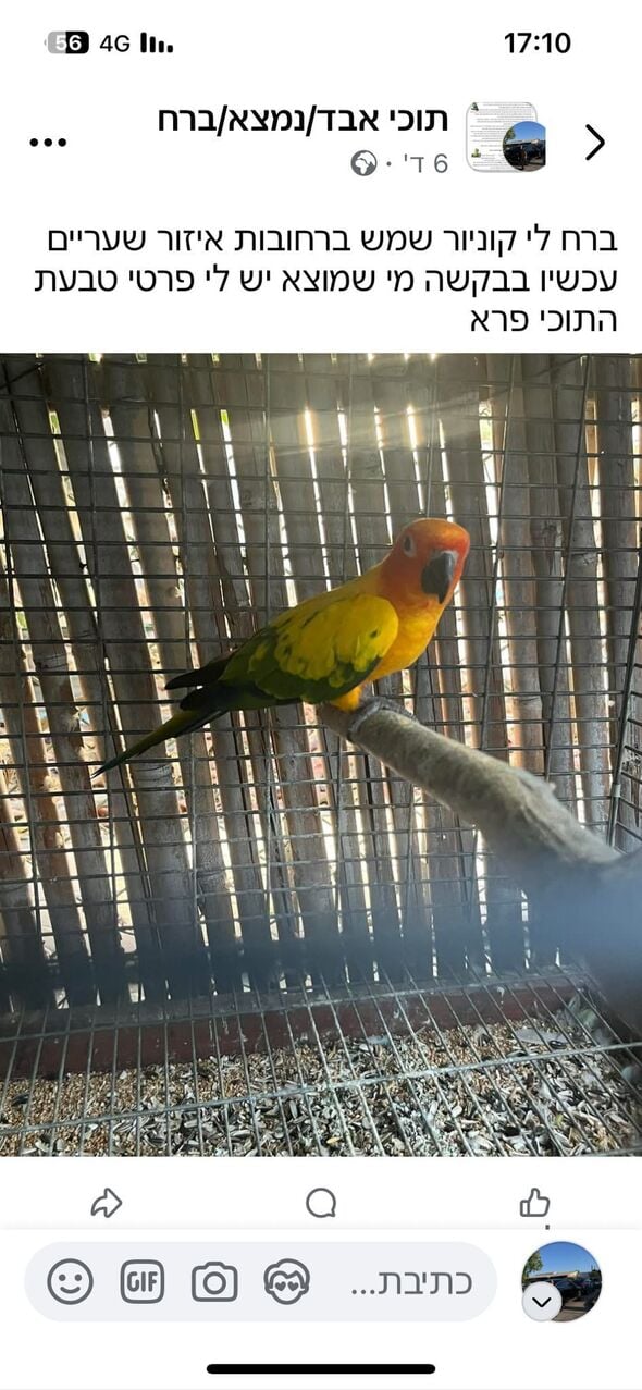 מי ראה/מצא תוכי שנעלם בשכונת שעריים ברחובות! ליצירת קשר: 054-956-3155
