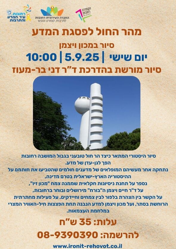סיור היסטורי תחת הכותרת "מהר החול לפסגת המדע" יתקיים במכון ויצמן ביום שישי, 5 בספטמבר 2025, בשעה 10:00. את הסיור ידריך ד"ר דני בר-מעוז.