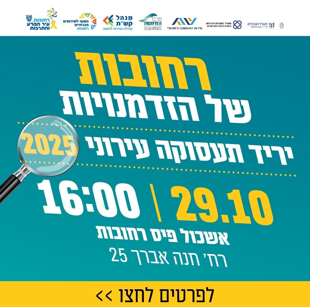"רחובות של הזדמנויות": עיריית רחובות מזמינה את תושבות ותושבי העיר להפנינג תעסוקה ראשון מסוגו ביום רביעי 29.10, בשעות 19:00-16:00,באשכול פיס, רחוב חנה אברך 25 (בית הספר קציר א’).