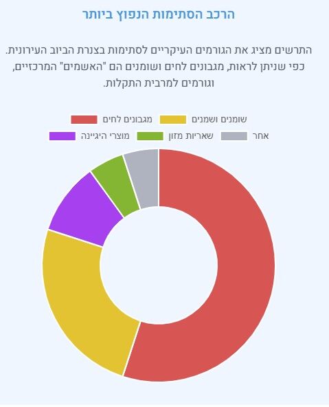 התרשים מציג את הגורמים העיקריים לסתימות בצנרת הביוב העירונית. כפי שניתן לראות, מגבונים לחים ושומנים הם "האשמים" המרכזיים, וגורמים למרבית התקלות.