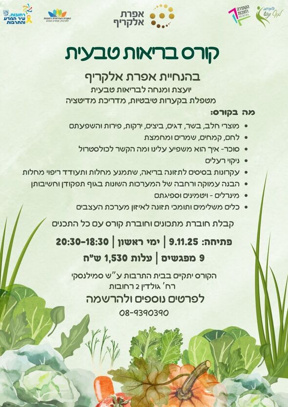 קורס בריאות טבעית חדש ברחובות: למדו כיצד להזין את הגוף, למנוע מחלות ולעודד ריפוי החל מה-9.11.25