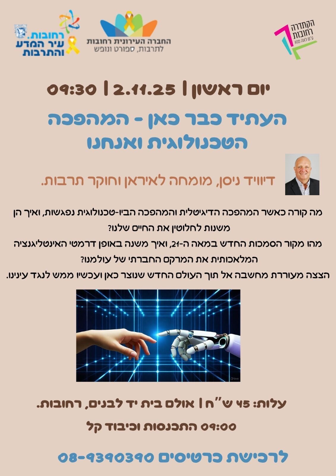 ביום ראשון, 2 בנובמבר 2025, בשעה 09:30, בבית יד לבנים רחובות תתקיים הרצאה בנושא "העתיד כבר כאן - המהפכה הטכנולוגית ואנחנו", אותה יעביר דיוויד ניסן, מומחה לאיראן וחוקר תרבות.