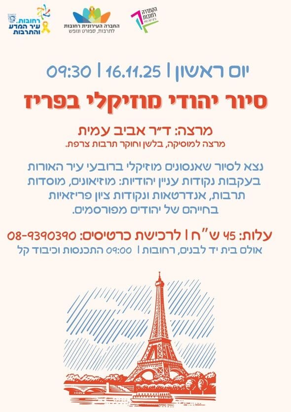 ראשון על הבוקר ברחובות: ד"ר אביב עמית בהרצאה על סיור יהודי מוזיקלי בפריז ב-16.11.25