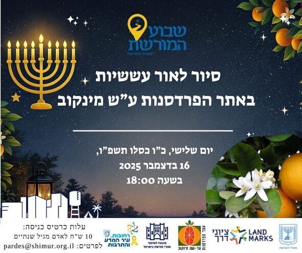 לכבוד חג החנוכה, יתקיים סיור עששיות חווייתי באתר הפרדסנות ע"ש מינקוב. הסיור מותאם להורים ולילדים וכולל פעילות בין המבנים ההיסטוריים, התצוגות השונות וברחבי הפרדס.