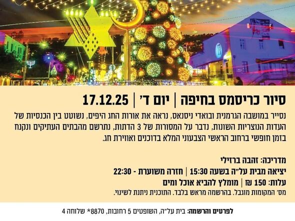 עמותת על״ה מזמינה את בני הגיל השלישי להצטרף לסיור מיוחד בחיפה, שיתמקד במושבה הגרמנית ובוואדי ניסנאס באווירת חג המולד. הסיור מציע חוויה חגיגית הכוללת צפייה באורות החג, שיטוט בין הכנסיות והעדות הנוצריות, ושיח על מסורות החג והבתים העתיקים בעיר.