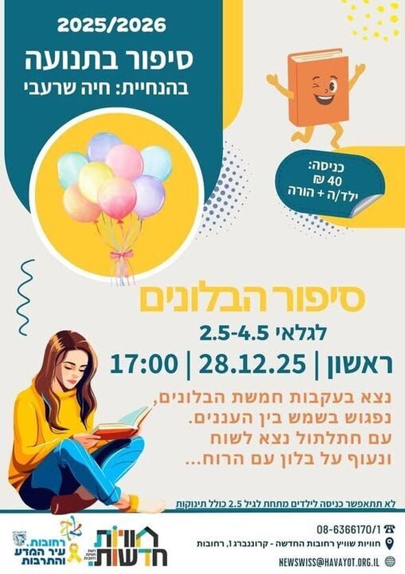 הורים לילדים בגילאי שנתיים וחצי עד ארבע וחצי מוזמנים להשתתף במפגש חווייתי של "סיפור בתנועה". את הפעילות תעביר חיה שרעבי מרדכי, והיא תתמקד ב"סיפור הבלונים".