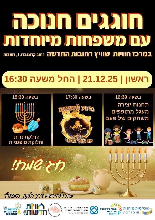 חגיגת חנוכה למשפחות מיוחדות ברחובות: מופע אש, יצירה והדלקת נרות בחוויות שוויץ רחובות החדשה תתקיים הערב (ראשון 21.12)