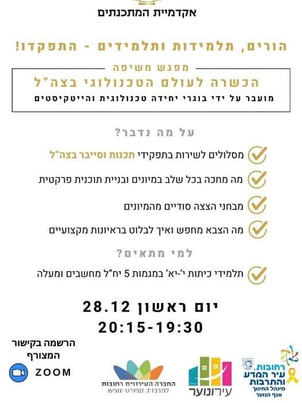 עירונוער רחובות מקיים מפגש זום מיוחד המיועד לתלמידי מגמות מחשבים בעיר, בו יתארחו בוגרי יחידות טכנולוגיות של צה"ל.