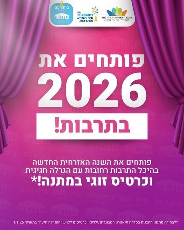 בית העם היכל התרבות רחובות מציין את פתיחת שנת 2026 בפעילות תרבותית מיוחדת, במסגרתה יחולק כרטיס זוגי במתנה לאחת ההצגות המוצגות בהיכל.