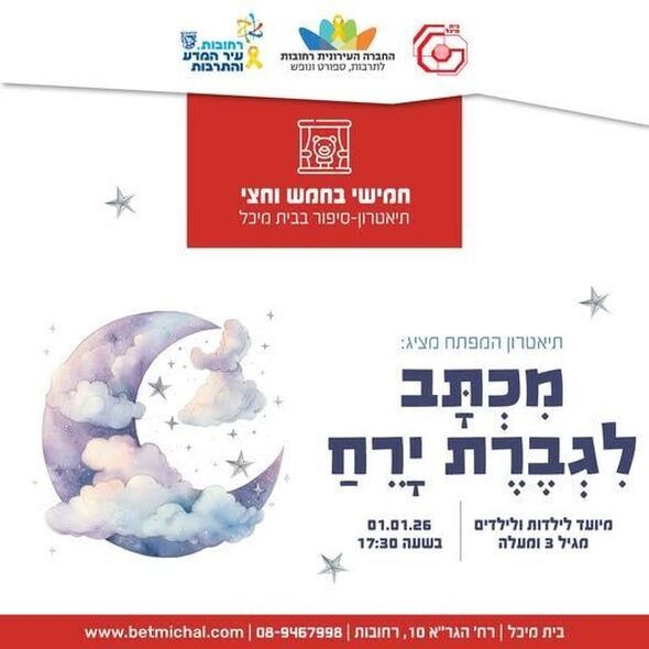 בית מיכל ברחובות מזמין את הקהל הרחב להצגה "מכתב לגברת ירח" מבית תיאטרון המפתח. ההצגה תתקיים ביום חמישי, ה-1.1, בשעה 17:30.