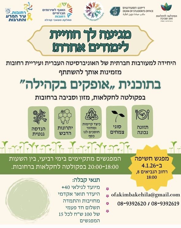 היחידה למעורבות חברתית של האוניברסיטה העברית ועיריית רחובות משיקות את תוכנית "אופקים בקהילה" בפקולטה לחקלאות: לימודי העשרה לבני 40 פלוס - מפגש חשיפה יתקיים ב-4.1.26