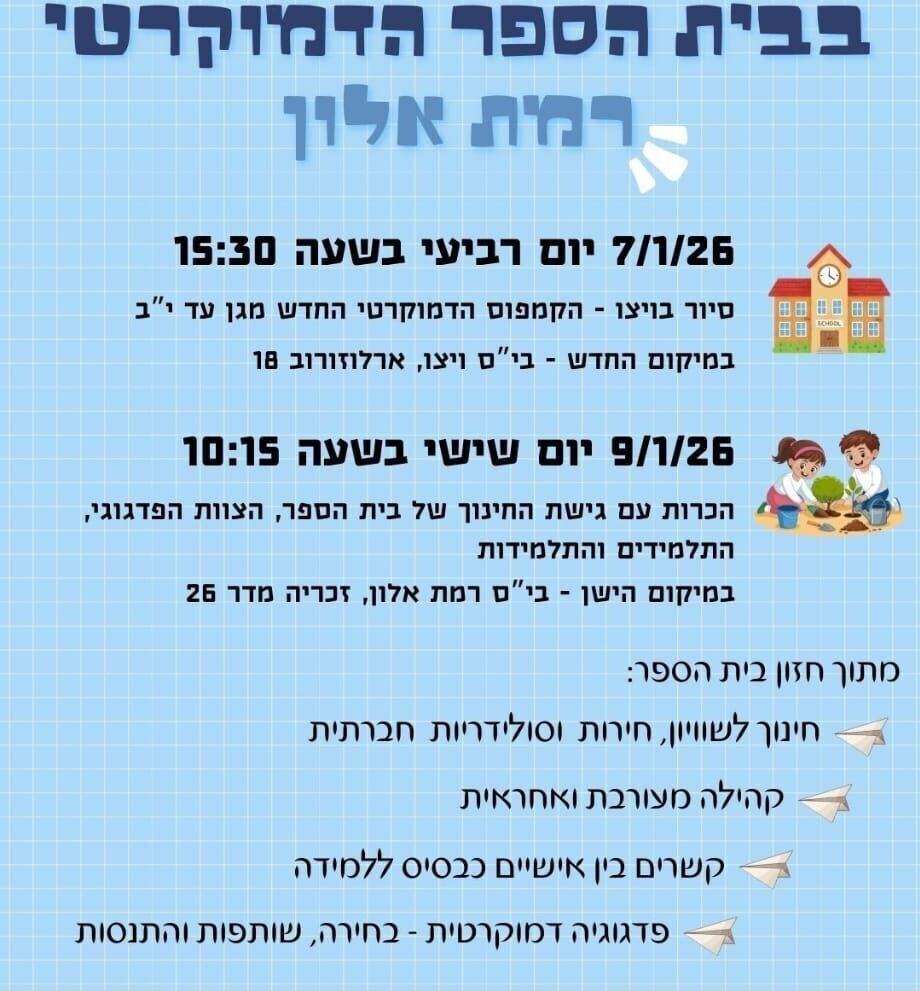לקראת המהלך, יתקיים סיור במיקום החדש של הקמפוס הדמוקרטי בבית הספר ויצ"ו, הממוקם ברחוב ארלוזורוב 18 ברחובות. הסיור ייערך ביום רביעי, ה-7 בינואר 2026, בשעה 15:30.