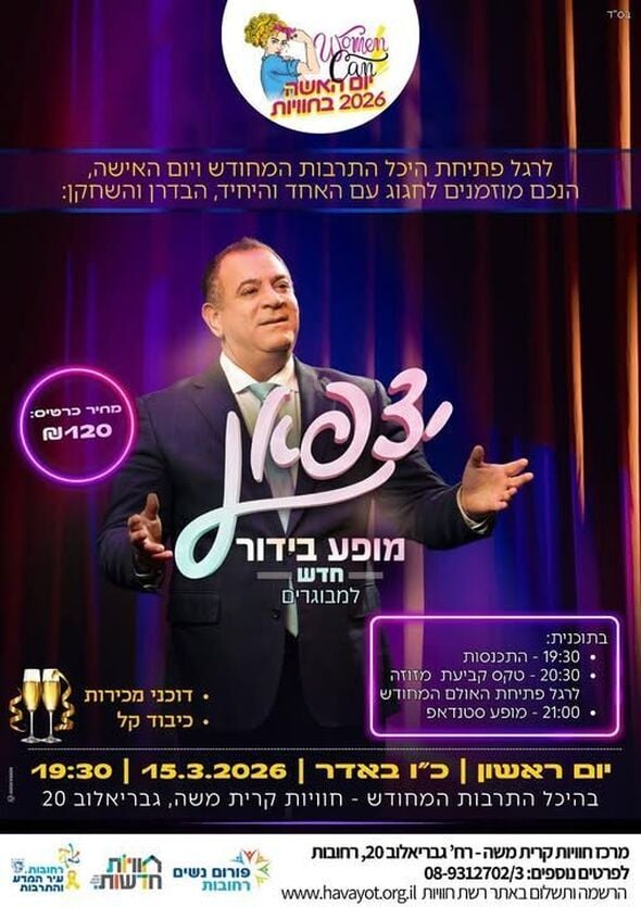 חגיגה כפולה ברחובות: מרכז חוויות קריית משה יציין את יום האישה וחנוכת היכל התרבות המחודש במופע של אלי יצפאן ב-15.3.2026
