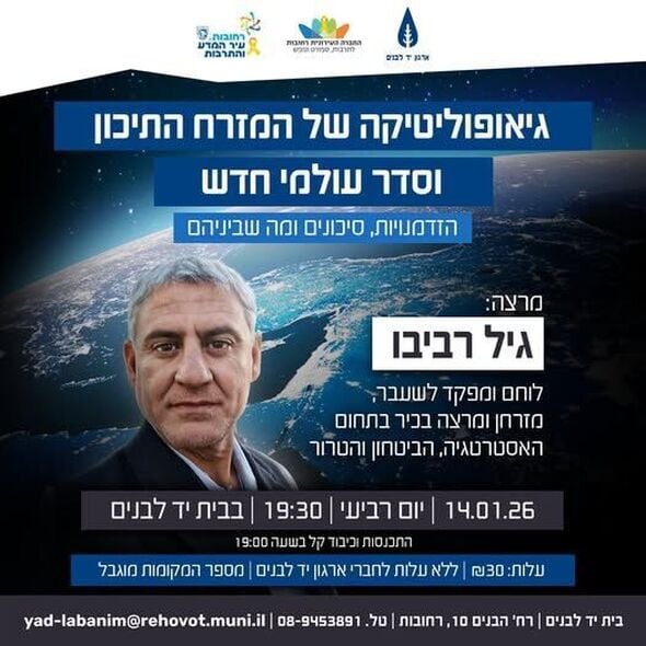 ביום רביעי, ה-14.1.26, בשעה 19:30, תתקיים הרצאה בנושא "גיאופוליטיקה של המזרח התיכון וסדר עולמי חדש". את ההרצאה יעביר גיל רביבו, לוחם, מפקד ואיש חינוך, המשמש כמרצה בכיר ומזרחן.