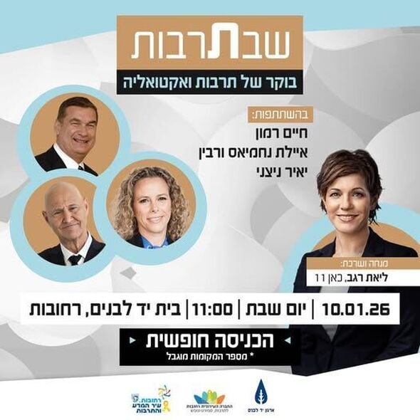 אירוע "שבתרבות" ברחובות יתקיים ביום שבת, ה-10 בינואר, בשעה 11:00. האירוע יציע בוקר של תרבות ואקטואליה, הכולל מפגש עם דוברים ויוצרים לשיח פתוח על חברה, פוליטיקה, תרבות והחיים עצמם. את האירוע תנחה ותערוך העיתונאית ליאת רגב מערוץ כאן 11.