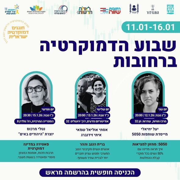שבוע הדמוקרטיה ברחובות יוצא לדרך: סדרת אירועים, הרצאות ומפגשים פתוחים לקהל הרחב בין ה-12 ל-15 בינואר