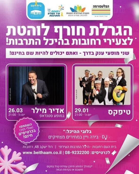 הפלטפורמה מרכז צעירים רחובות משיק הגרלת חורף: כרטיסים למופעים של טיפקס ואדיר מילר בהיכל התרבות - הזוכים יוכרזו ב-27.1.26