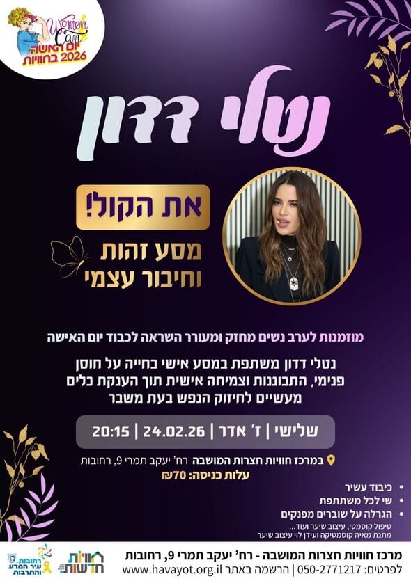 יום האישה 2026 ברחובות: ערב מעורר השראה עם נטלי דדון במרכז חוויות חצרות המושבה ב-24.2.26. בנוסף, כיבוד עשיר ושי לכל משתתפת, הגרלה של שוברים מפנקים, ביניהם טיפול קוסמטי, עיצוב שיער ועוד
