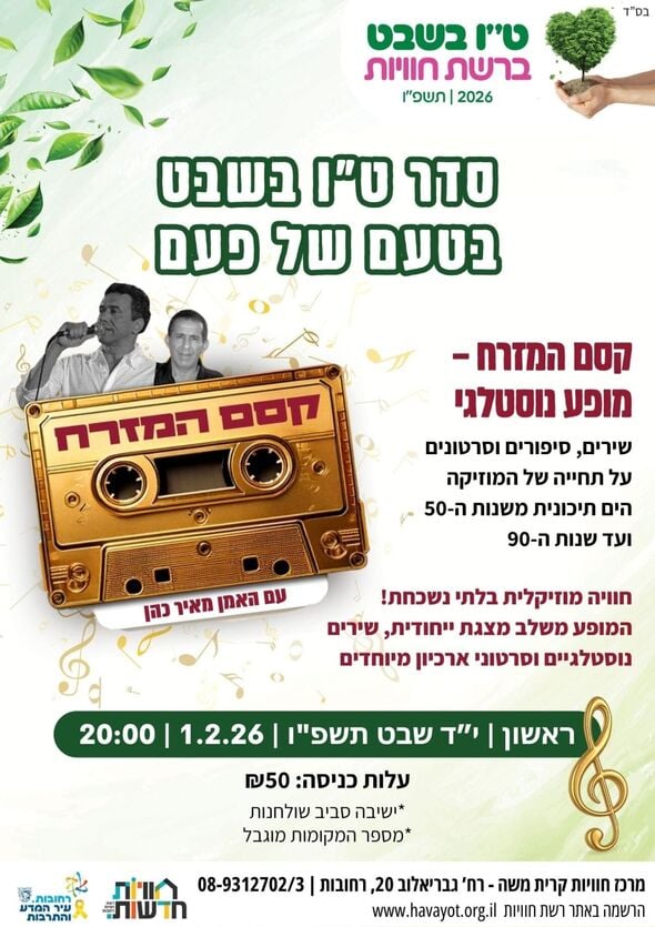 מרכז חוויות קרית משה מזמין את הציבור לערב של מוזיקה, נוסטלגיה ומסורת במסגרת חגיגות ט"ו בשבט. האירוע יכלול סדר ט"ו בשבט בטעם של פעם.
