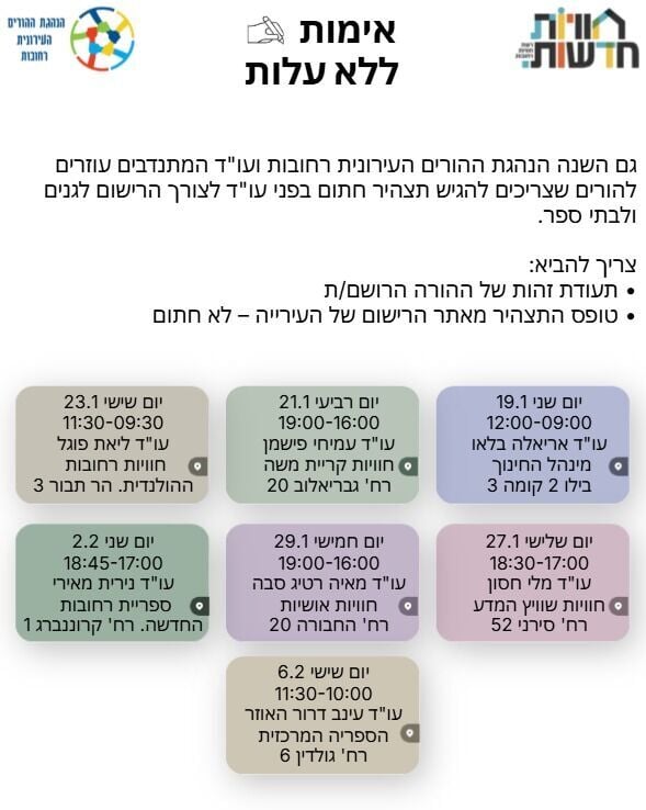 במסגרת ההיערכות להרשמה לשנת הלימודים תשפ"ז, הנהגת ההורים עורכי דין מתנדבים יגיעו למרכזי רשת "חוויות" ברחבי העיר על מנת לסייע להורים באימות תצהירים הנדרשים לצורך הרישום למוסדות החינוך. השירות יינתן ללא עלות.