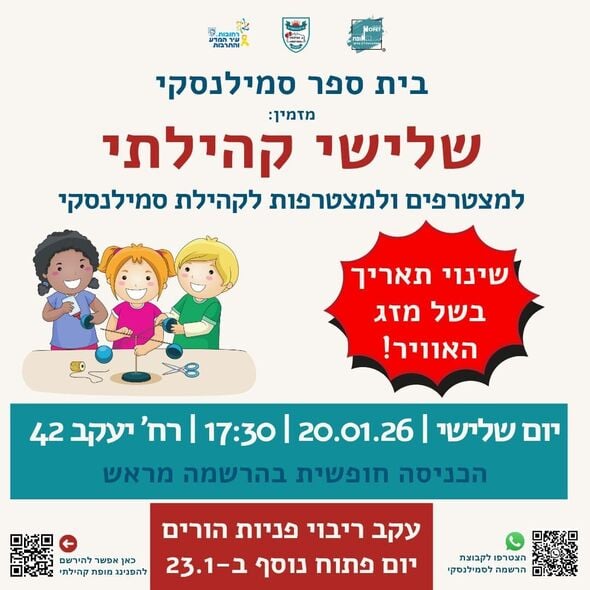 כמו כן, ניתן להצטרף לקבוצת הוואטסאפ הייעודית להרשמה לבית הספר סמילנסקי בקישור: הצטרפות לקבוצה