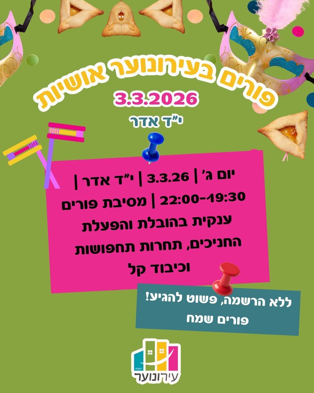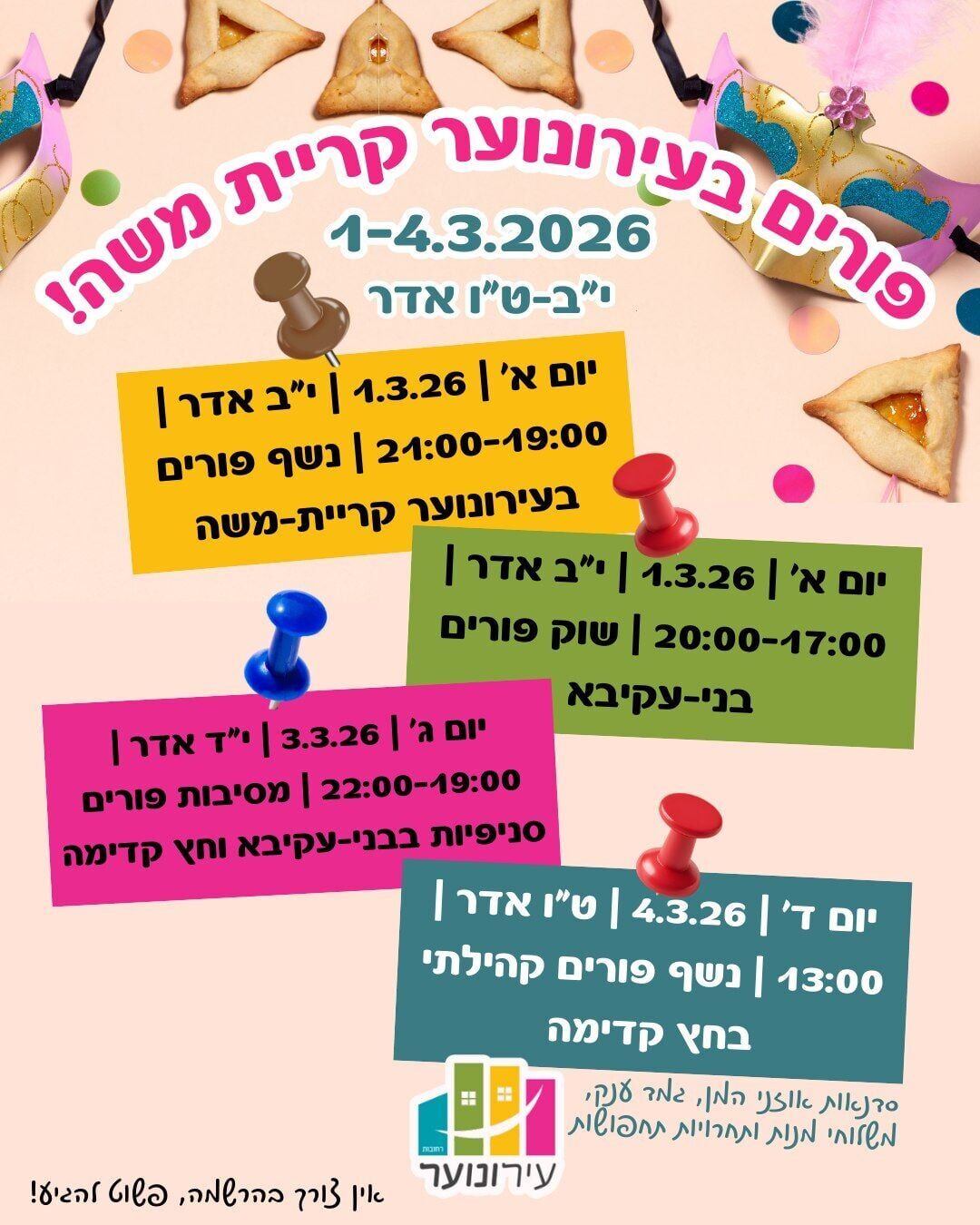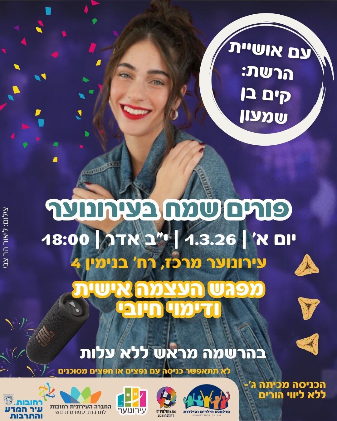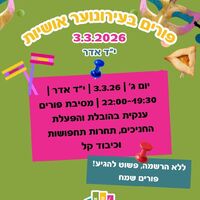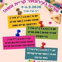 ביום ראשון, ה-1.3.26, החל מהשעה 18:00, יתקיים אירוע פורים עם קים בן שמעון. האירוע ייערך בעירונוער מרכז, ברחוב בנימין 4. ההשתתפות באירוע הינה ללא עלות, אך מספר המקומות מוגבל ויש להירשם מראש.